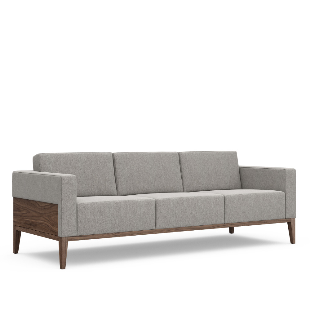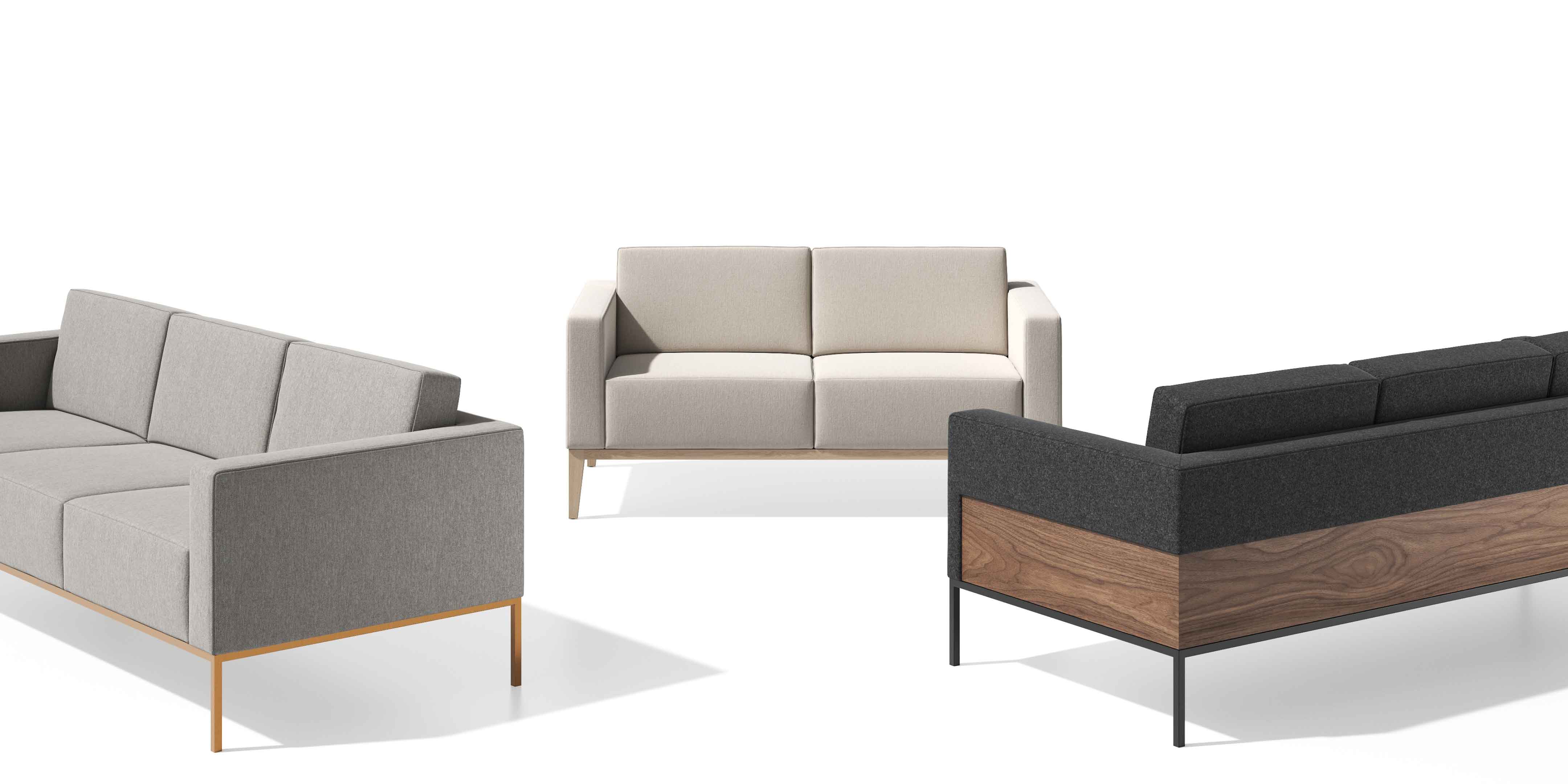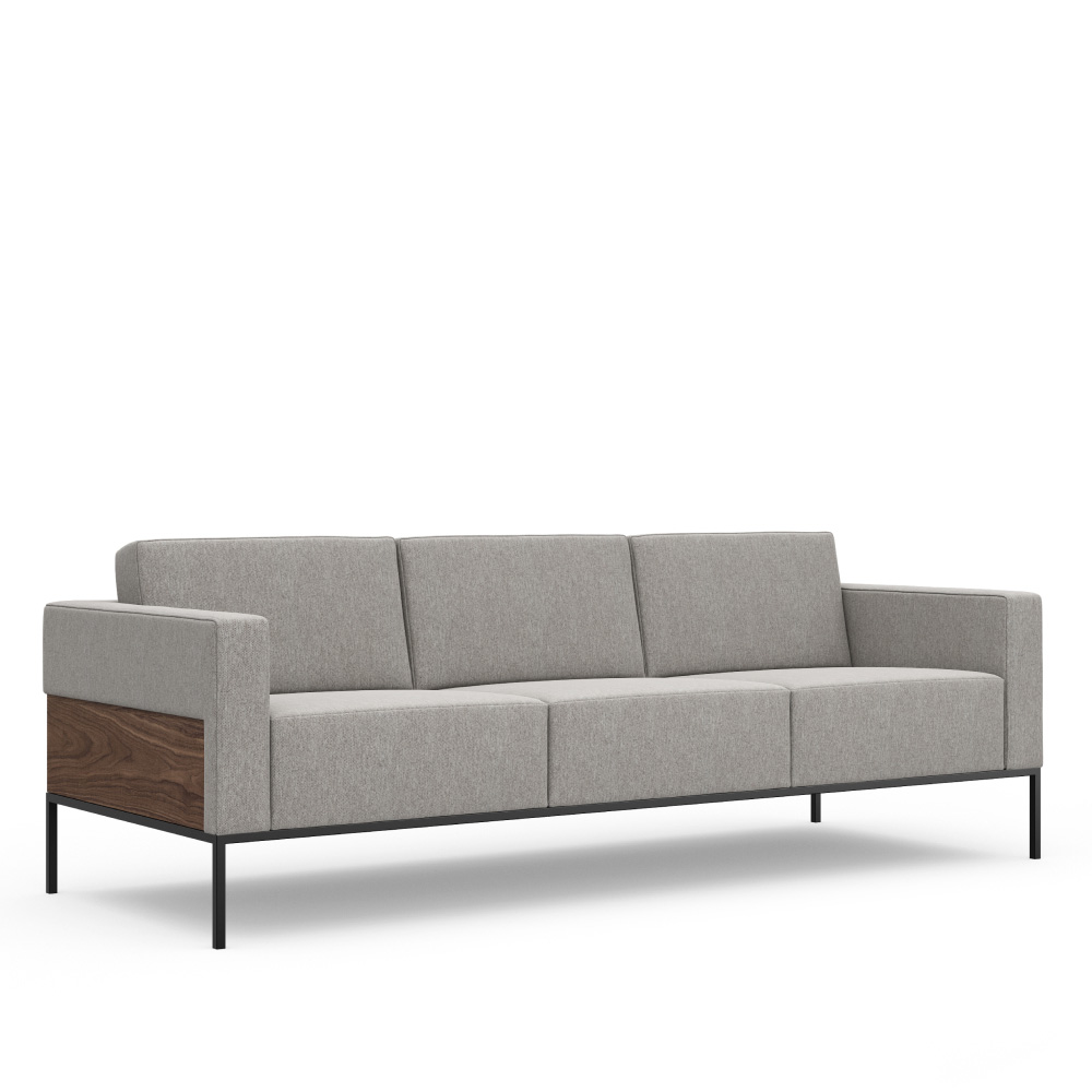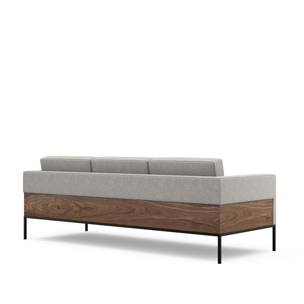 Simplicity of form, clean lines, and a harmonious blending of materials form the distinguishing characteristics of the Alia Sofa. Plush, fixed-cushion upholstery floats above an understated base of metal or wood, offering unsurpassed comfort with a classic visual appeal. Available in a fully upholstered option or with an exquisite wood panel surround.