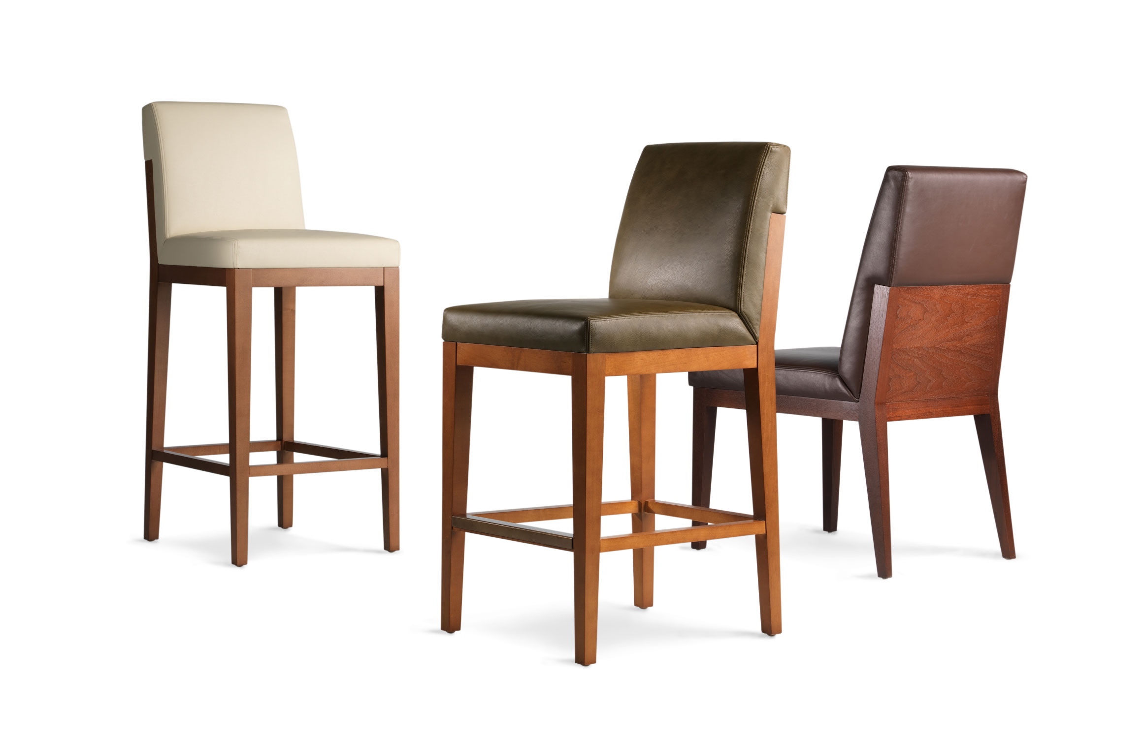 Simplicity of form, clean lines, and a harmonious blending of materials form the distinguishing characteristics of the Alia Stool. An exquisite wood panel extends up the back of the stool, providing an appealing contrast to the fine upholstery. Precise wood joinery ensures enduring beauty and strength. Available in counter and bar heights.