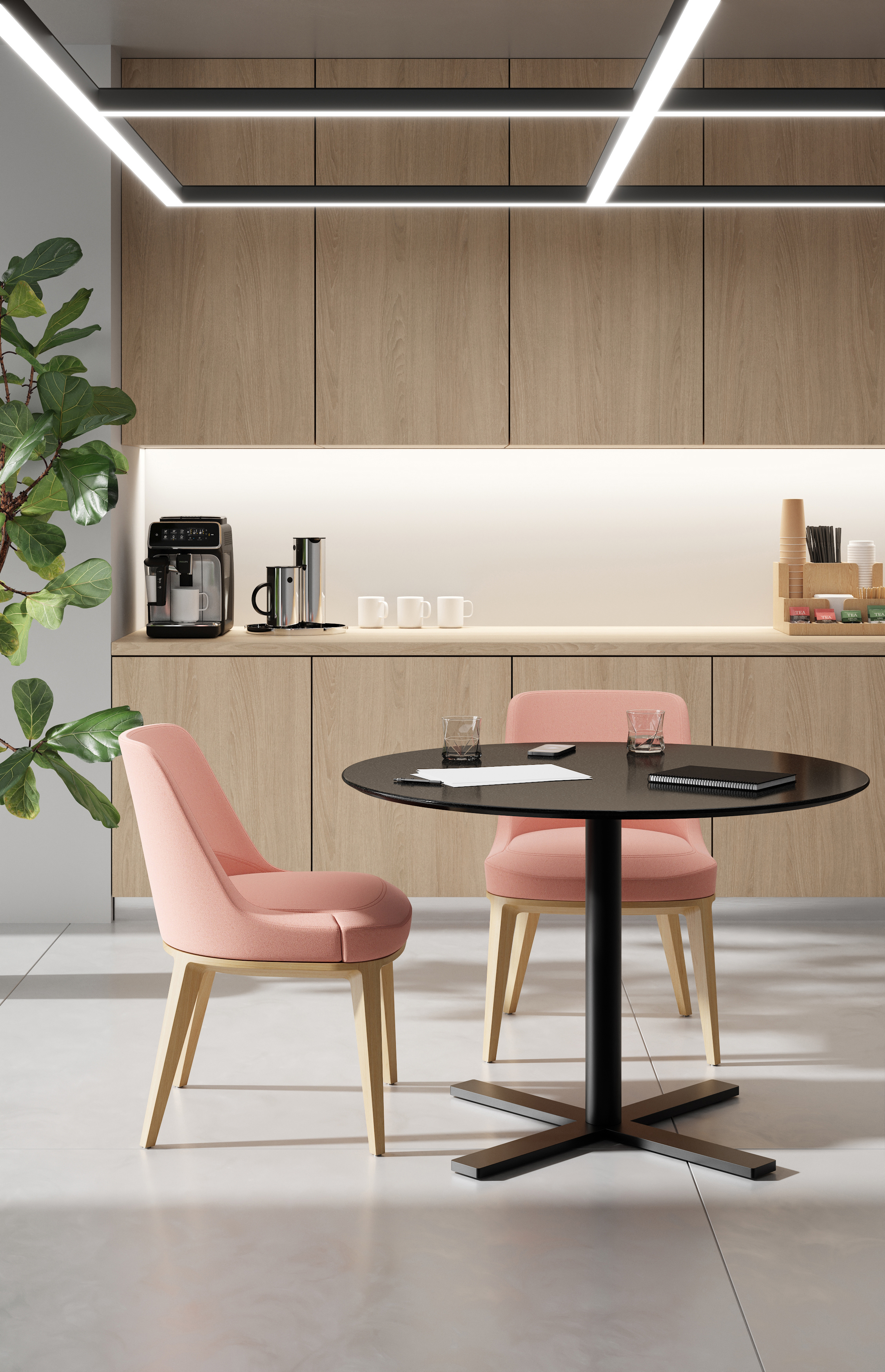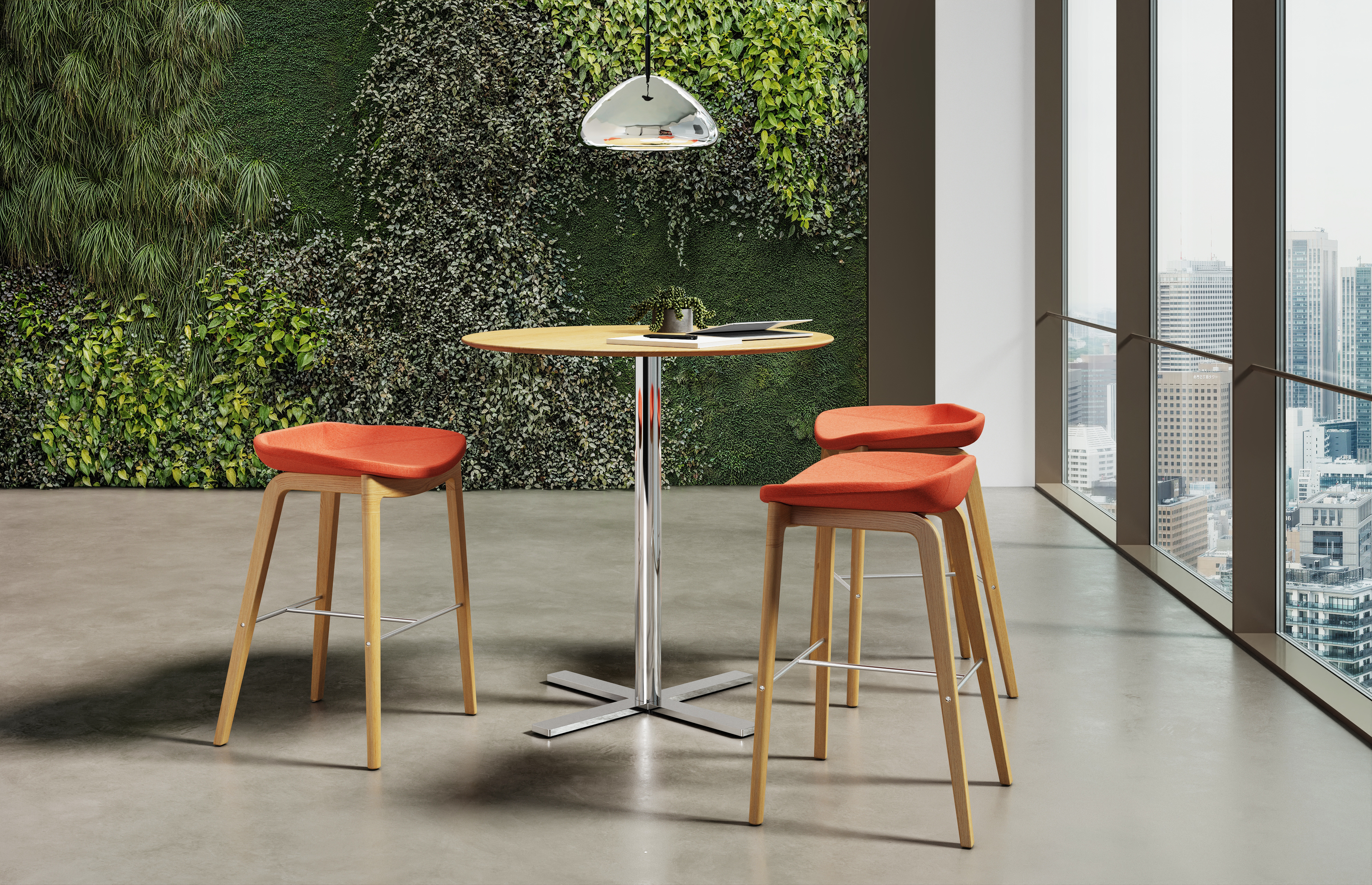 A true Cumberland classic, the Capri Meeting Table brings simple sophistication to spaces with its refined aesthetic. A steel X-shaped base combines strength and stability with understated style. Meeting tables are available in seated and standing heights with round, rectangle, and square surface shapes. Top choices include wood, stone, painted glass, or solid surface.