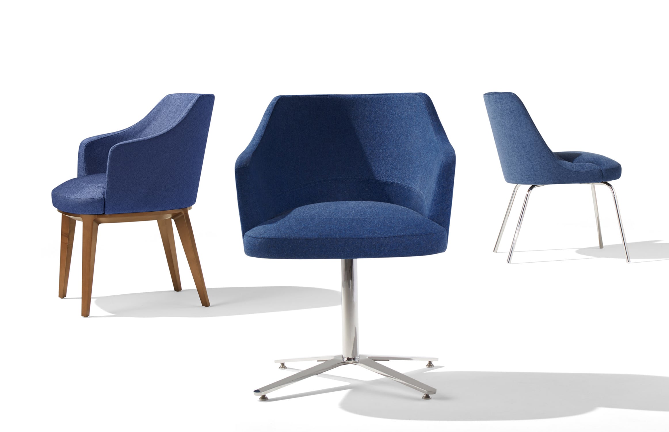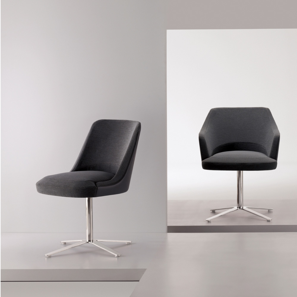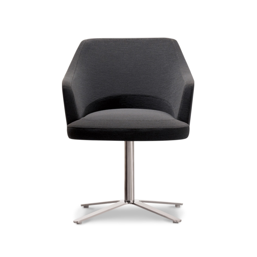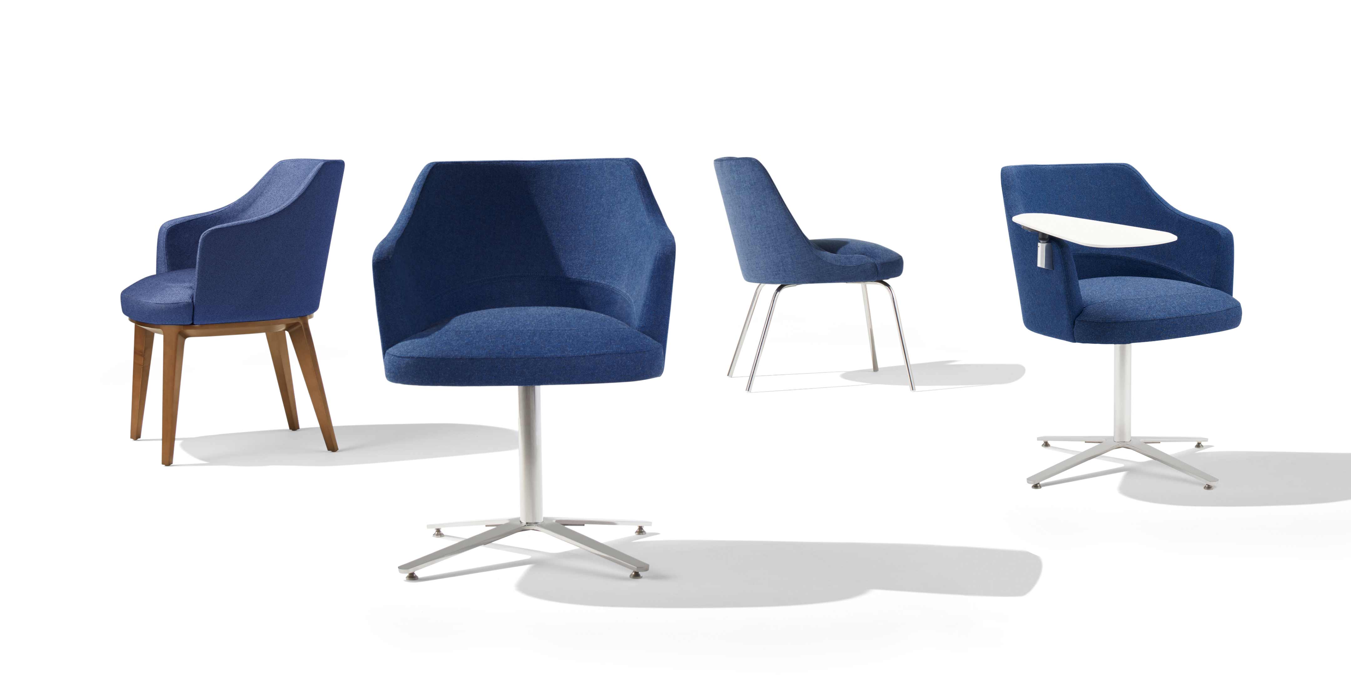 Featuring uniquely faceted upholstery defining the front edge of the seat, the Clover Guest Chair offers a modern take on the classic tub chair. Its form of refined bevels juxtaposed against soft shapes expresses a sophisticated beauty and attention to craft. Variations on the base, including a metal swivel column version or a four-legged version of wood or tubular steel, assure there’s a suitable version for every environment and application. Available with or without arms.
