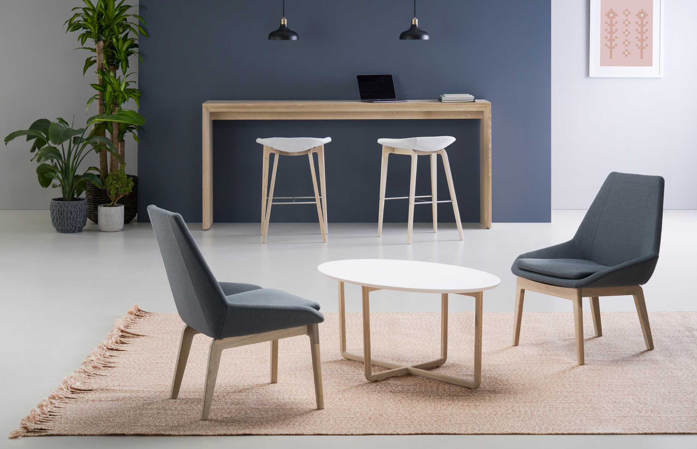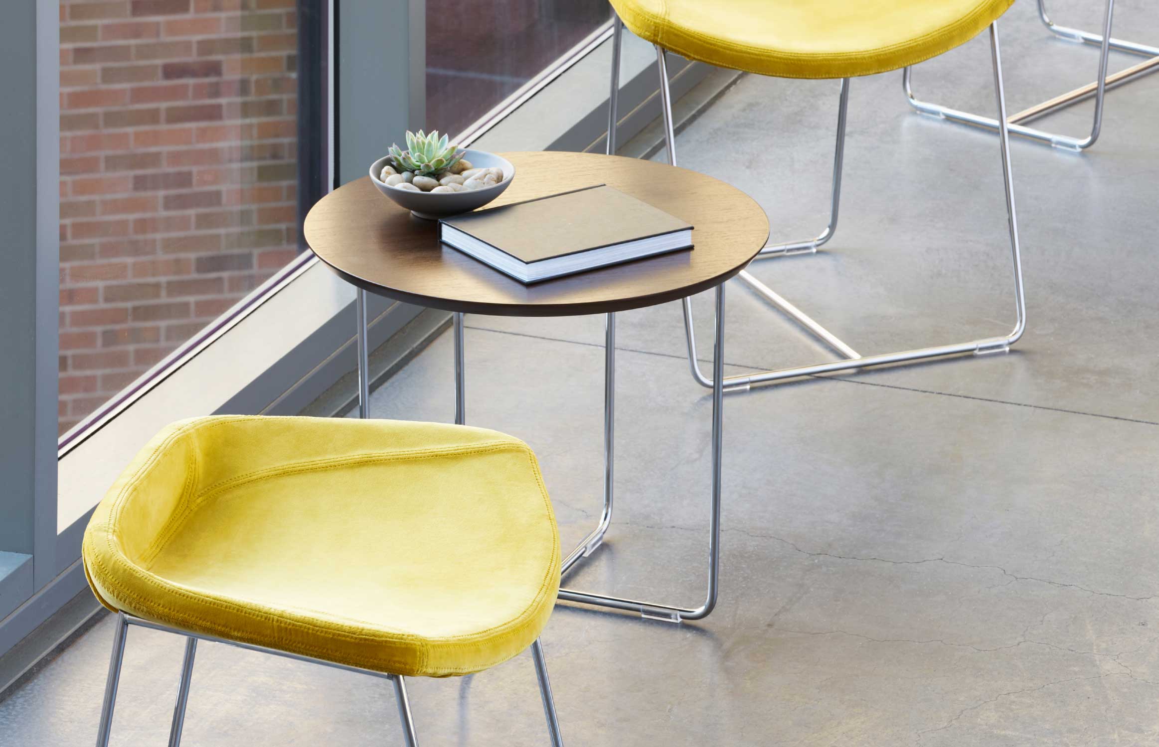 Sculptural, clean silhouettes and refined details are what distinguish the Current Occasional Table. Lightweight and movable yet stable and durable, the coffee or side table offers a fresh form for flexibility in any environment. Choose from a contoured wood base that adds visual warmth to spaces or a sleek stainless steel base for a minimalist aesthetic. Offered in round, square, or oval shapes with wood or solid surface tops.
