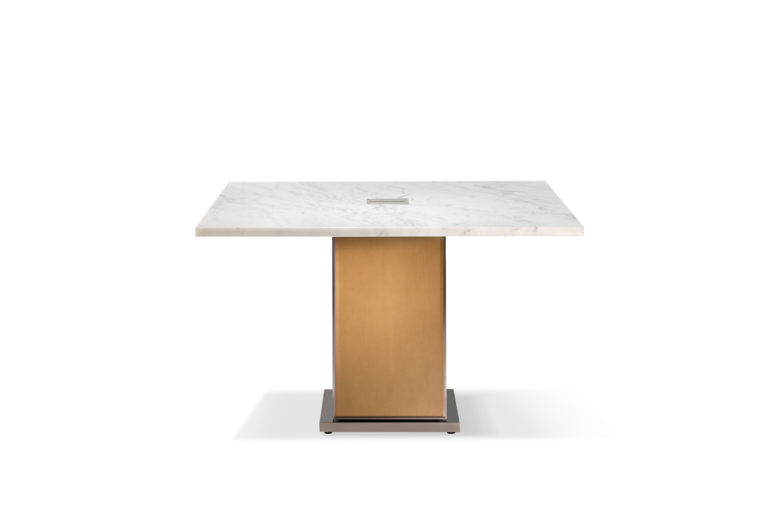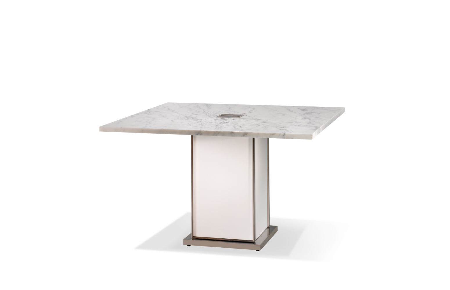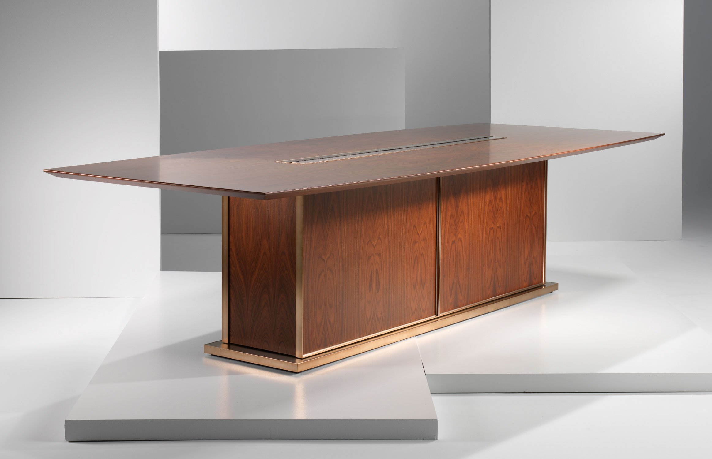 Exquisite in form and efficient in function, our Fortis Meeting Table adds a strong architectural aesthetic to conference rooms. A completely enclosed base provides convenient access to wires and cables while full capabilities for power, data, and voice are available as options. A wide range of sizes with either wood or stone tops is available. Surface shapes include round, square, rectangular, and boat. Other aesthetic choices include top edge, base panel material, and base metal trim options.