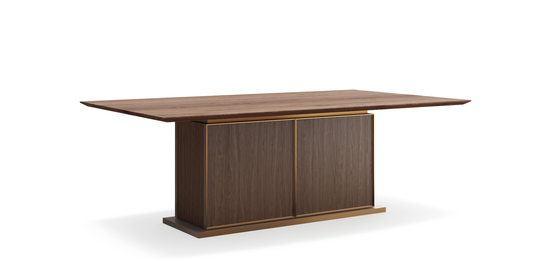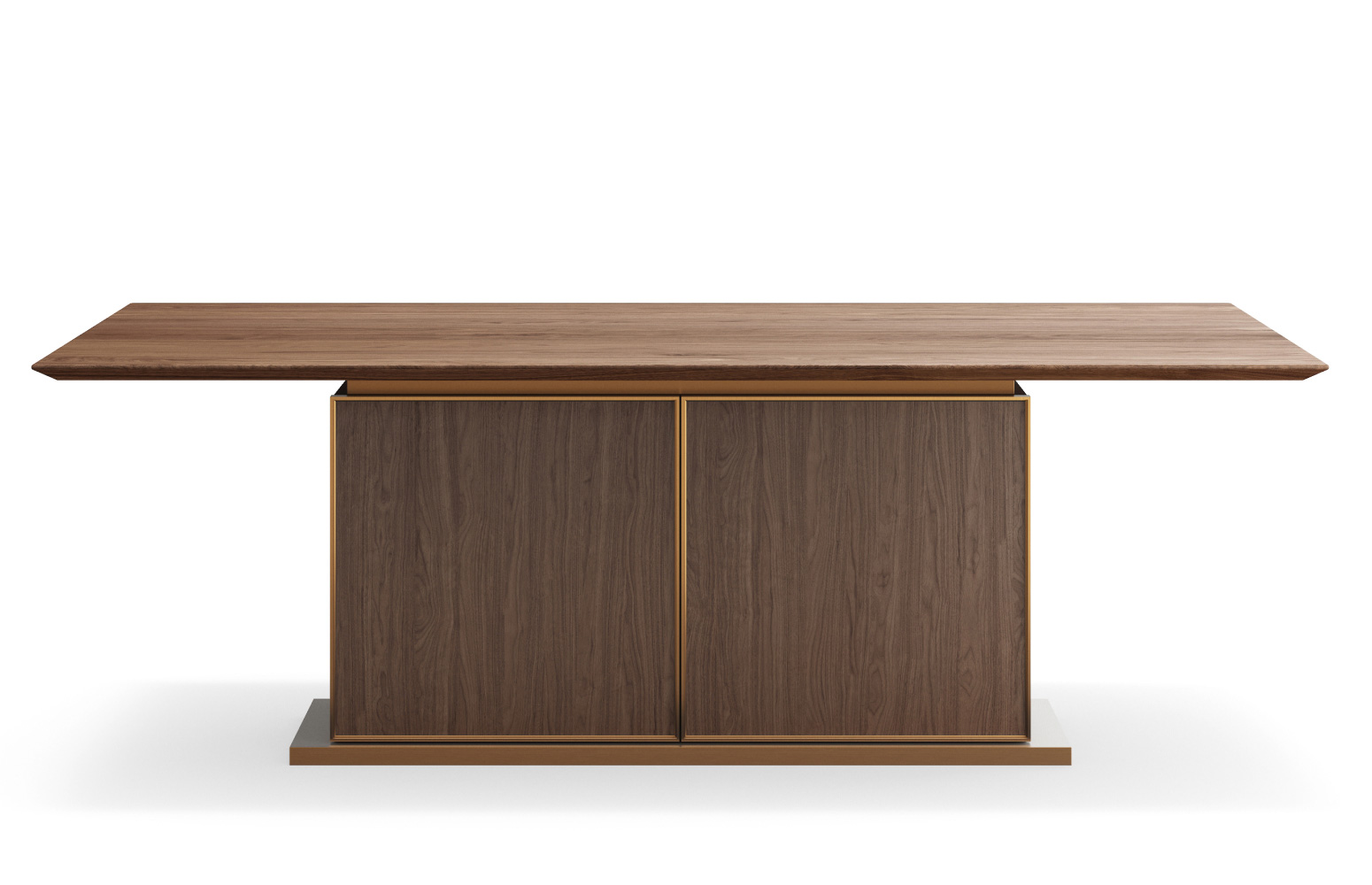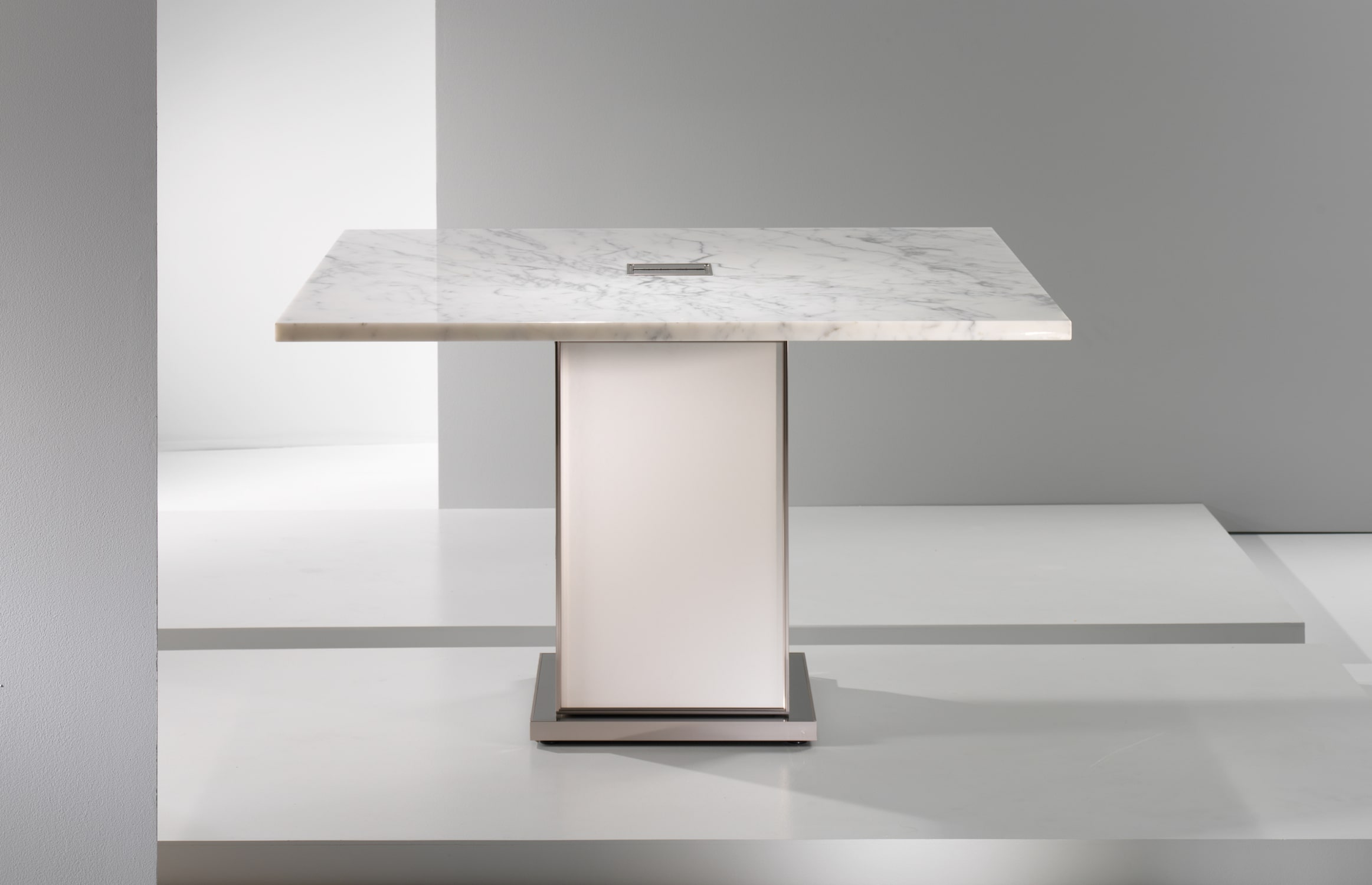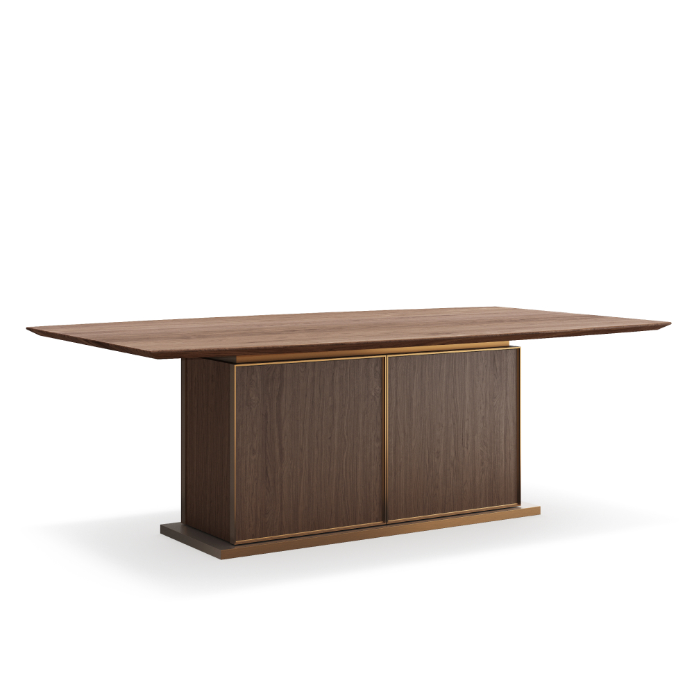 Exquisite in form and efficient in function, our Fortis Meeting Table adds a strong architectural aesthetic to conference rooms. A completely enclosed base provides convenient access to wires and cables while full capabilities for power, data, and voice are available as options. A wide range of sizes with either wood or stone tops is available. Surface shapes include round, square, rectangular, and boat. Other aesthetic choices include top edge, base panel material, and base metal trim options.
