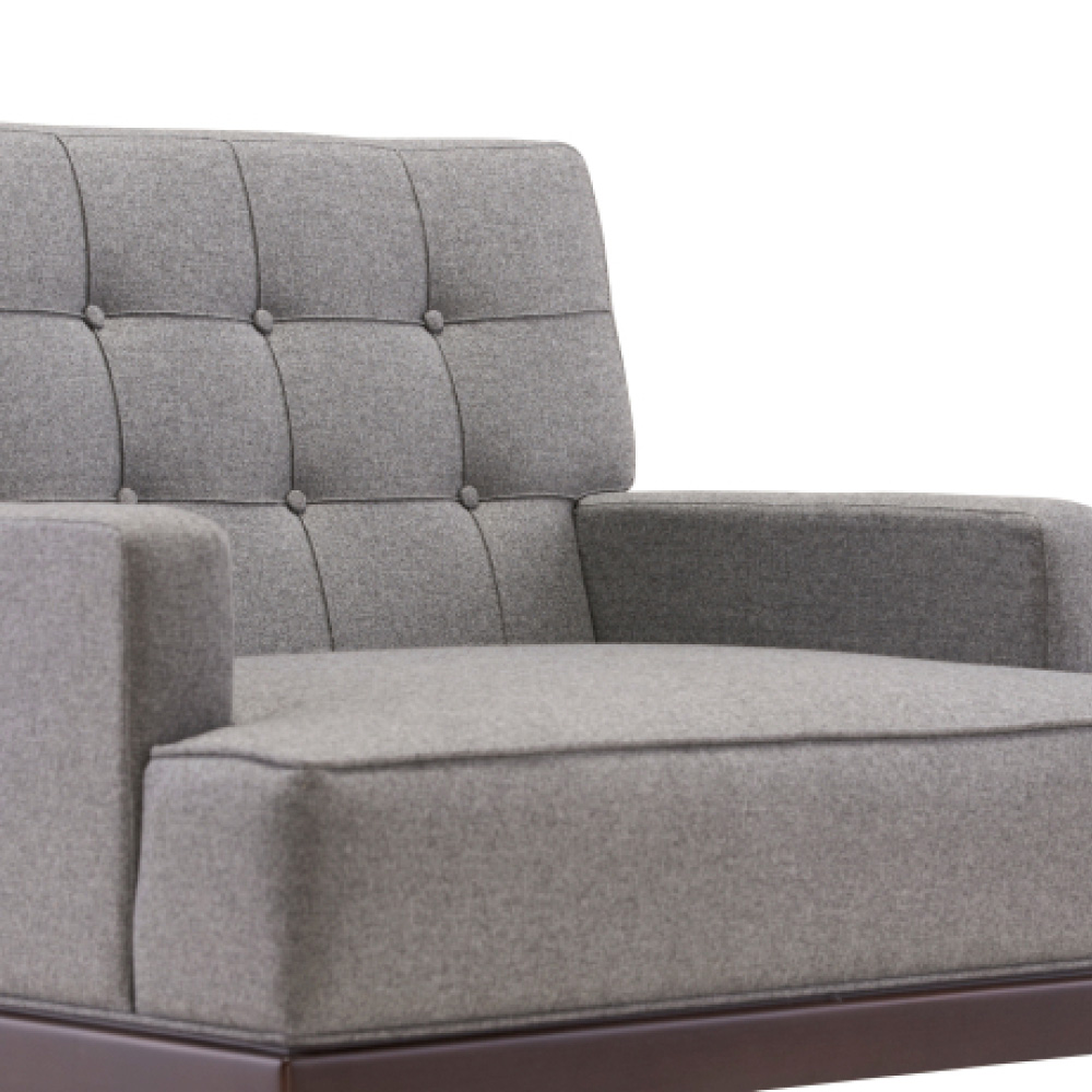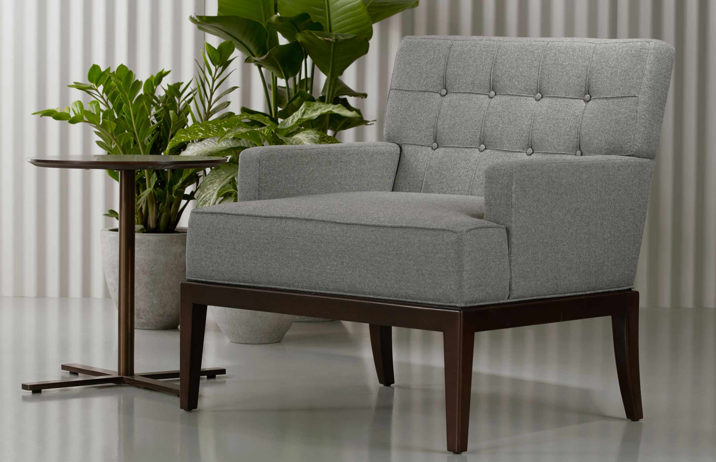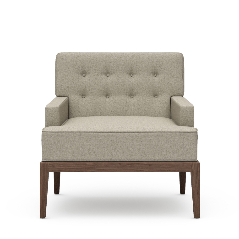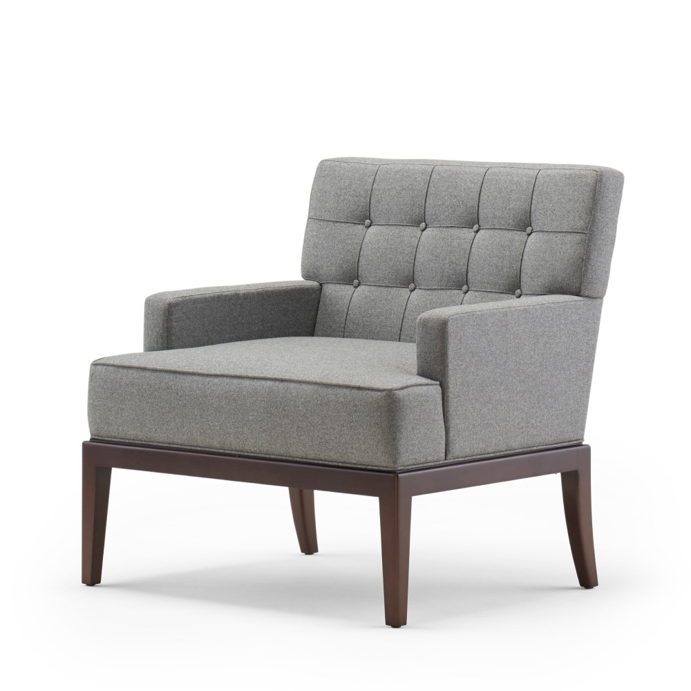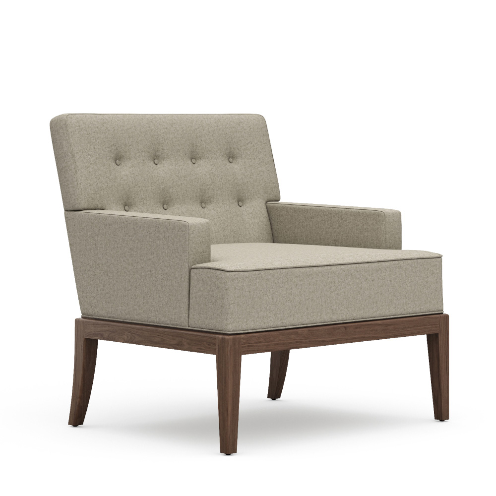Our Sloane Lounge Chair epitomizes the balance between relaxed style and understated luxury characteristic of the West Coast. Its design captures the eye with a finely crafted solid wood base and an angular, button-tufted back cushion that exemplifies timeless tailoring. As to comfort, Sloane satisfies with fixed, ample-width deep cushioning and generous proportions. Available with button-tufted upholstery as a standard back option, the lounge can also be specified with only buttons, tufting, or with a plain back for a different aesthetic.