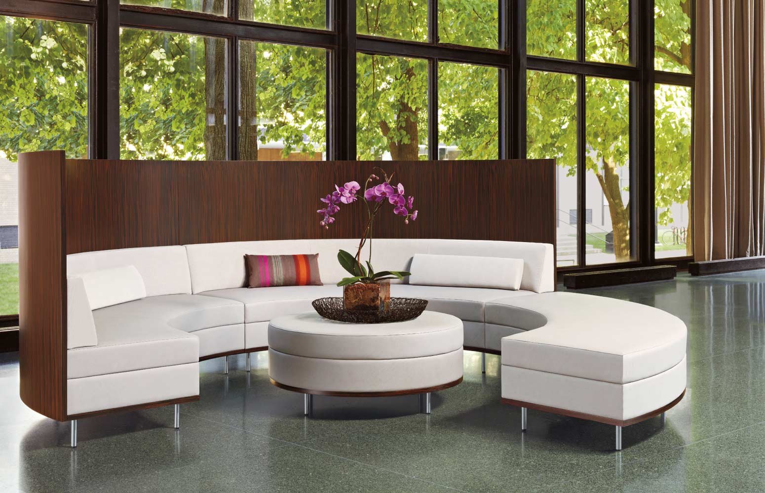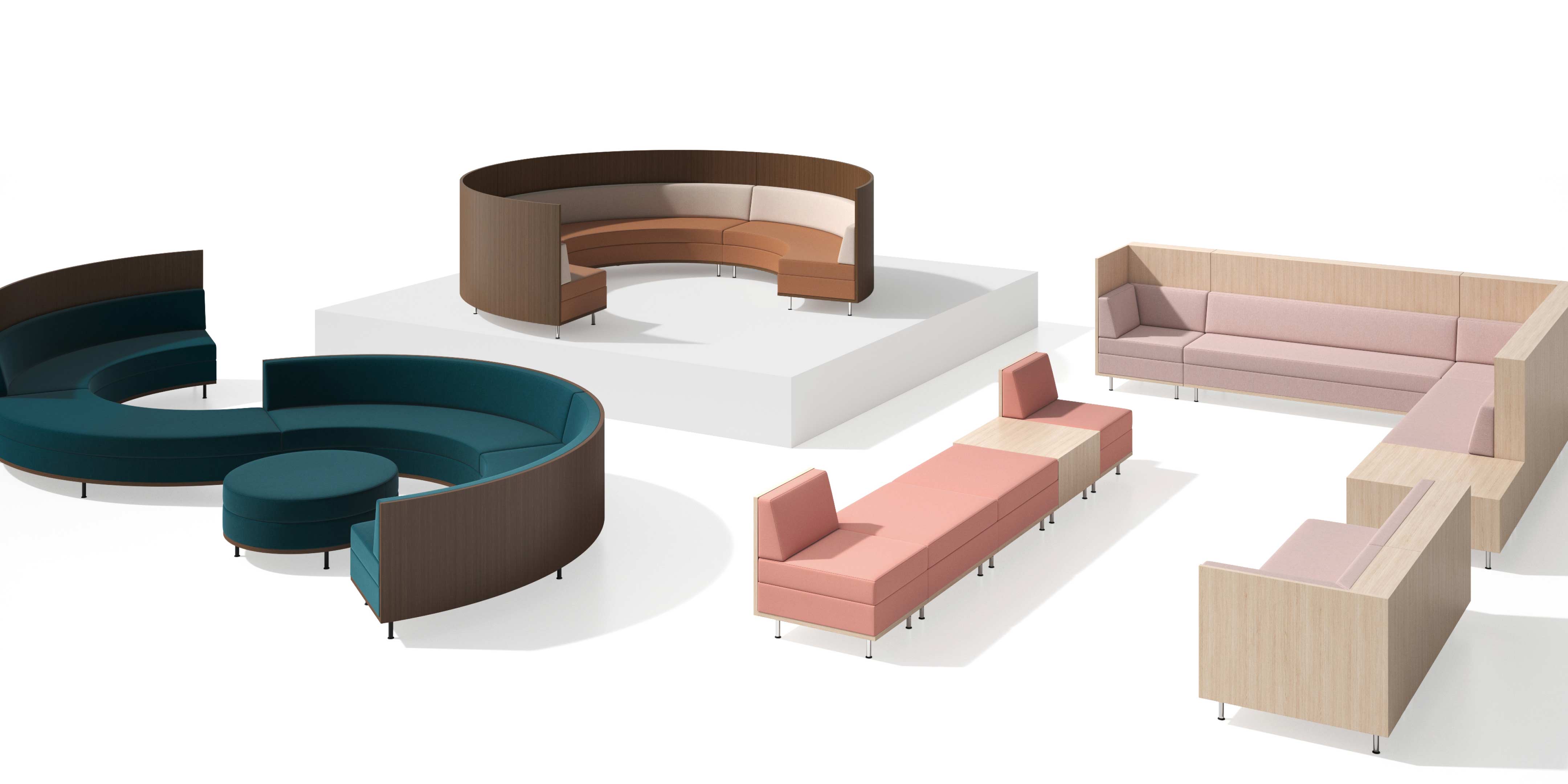Add visual interest to open spaces with our Thick and Thin Modular system, which features elements that can be used as standalone or combined to meet a broad range of layouts and needs. Curved and straight lines, thick and thin proportions, and varying heights offer designers a versatile palette to support any space. Facilitate privacy, encourage interaction, or direct traffic flow between spaces without building architectural walls with this highly adaptable system of seating and tables.